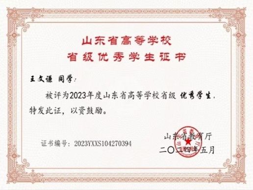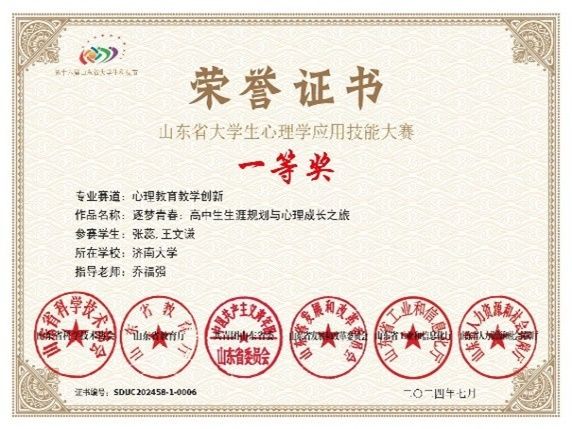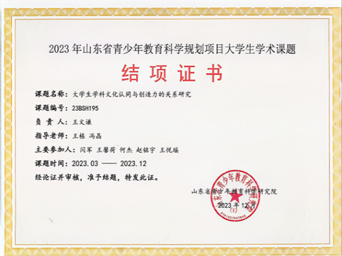 科研创新:2023年度山东省青少年教育科学规划项目大学生学术课题结题1项(第1位,共6位);山东省大学生心理学应用技能大赛一等奖(第2位,共2位);2022年度山东省大学生科研项目结题1项(第3位,共4位);山东省大学生心理学应用技能大赛二等奖(第2位,共5位);2024年度山东省大学生科研项目立项1项(第2位,共3位);校大学生创新创业训练计划结题2项(第1位,共5位);