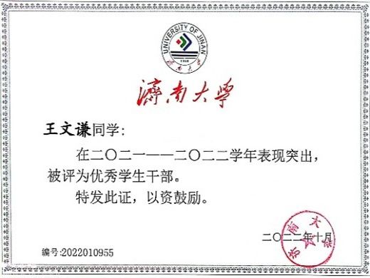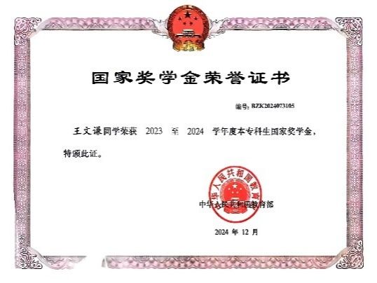 主要获奖:国家奖学金、省优秀学生、校一等奖学金、校优秀学生、校优秀学生干部、校优秀毕业生、校优秀团员、校优秀青年志愿者、校疫情防控优秀青年志愿者、校大学生志愿者暑期文化科技卫生“三下乡”社会实践三等奖。