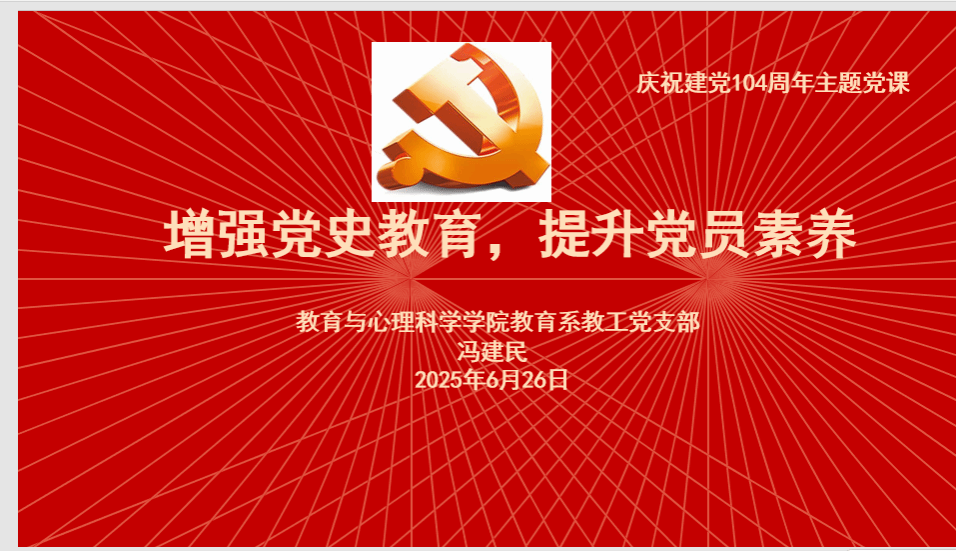 6月26日,在庆祝中国共产党成立 104 周年之际,为增强党员党性教育,传承红色基因、弘扬传统文化,推动教学科研工作高质量发展,6165cc金沙总站检测中心教育系教工党支部精心组织了一场意义深刻的主题党课。党课以腾讯会议线上方式进行。本次党课讲授人为教育系教工党支部书记冯建民。