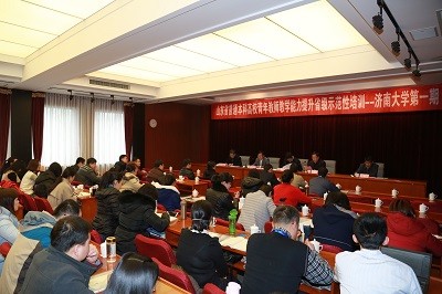 济南大学张士强校长致辞指出,山东省教育厅教师工作处主办的这项培训工作对推动广大青年教师的教学能力,提高青年教师的教学水平具有重要作用。张士强校长介绍了济南大学目前发展的整体状况,他指出济南大学目前形成了以院士、泰山学者领头的结构合理的教师队伍,强调了青年教师成长在高等学校发展中的重要作用。