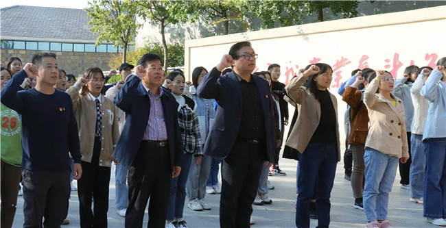 大峰山革命根据地是抗日战争、解放战争的坚强战斗堡垒,是山东联系延安秘密交通线上的重要中转站,是培养党政军干部的红色摇篮,在讲解员的带领下,大家参观了大峰山革命根据地纪念馆、长清县委办公旧址,一件件革命实物,一张张鲜活的图片,带大家回顾革命历史,追忆红色精神;在初心广场,大家高举右手,重温入党誓词,面对鲜红的党旗,再次庄严宣誓,表达了对党的无限忠诚和坚定信念。