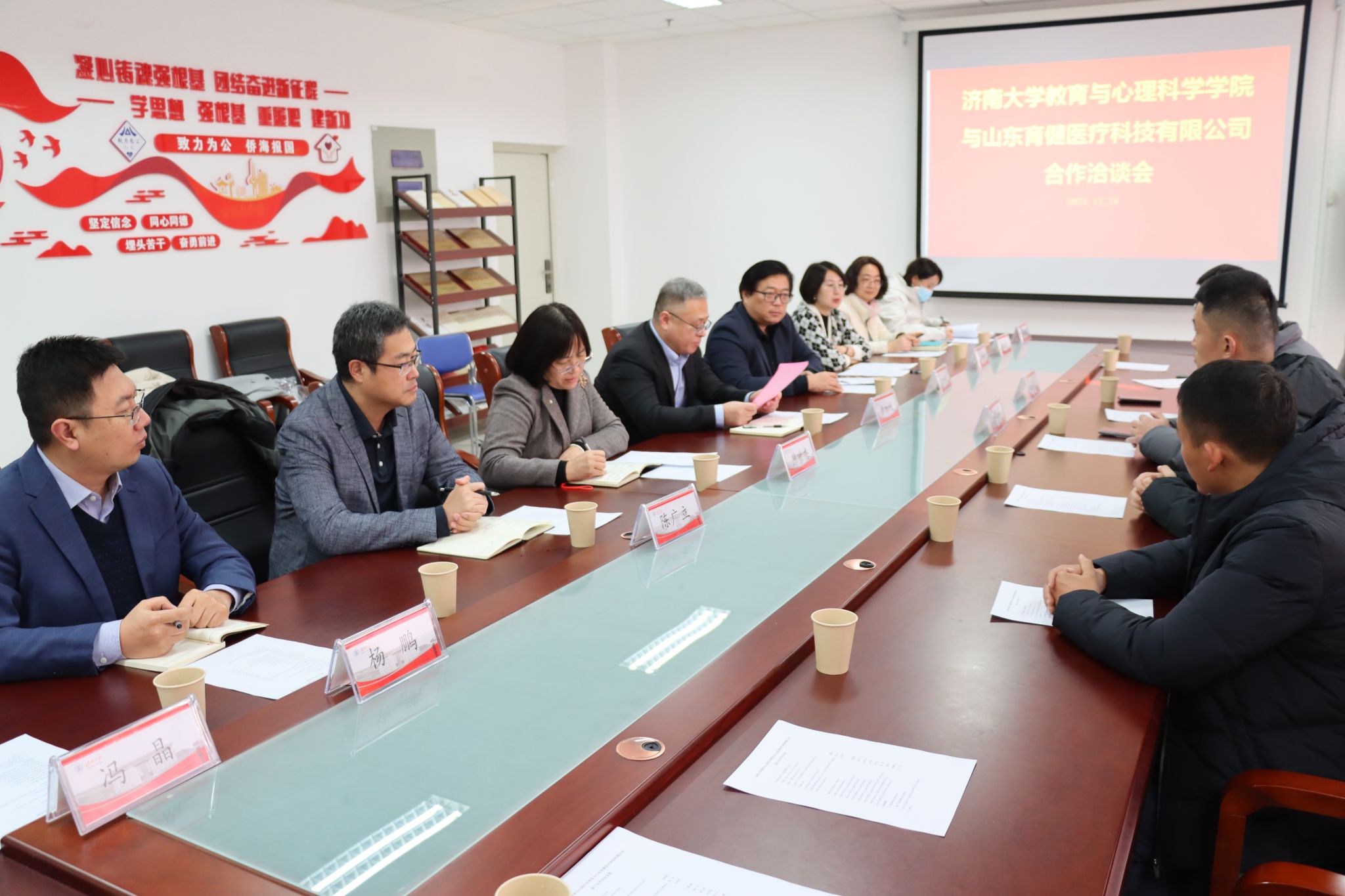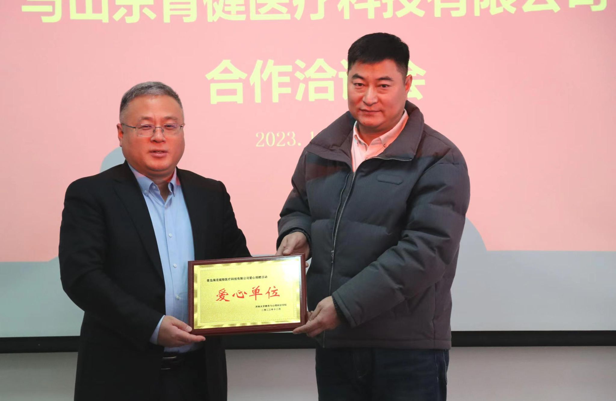 黄加栋对总经理邹雪茜和杜华民一行表示欢迎,感谢山东育健医疗科技有限公司的爱心善举,期待6165cc金沙总站检测中心与山东育健医疗科技有限公司联合成立研究院后能够开展更深层次的交流与合作,并表示济南大学一定会把这份爱心转化为发展的动力,用优异的育人成果来回馈社会。邹雪茜总经理感谢6165cc金沙总站检测中心给予山东育健医疗科技有限公司此次合作机会,公司后续将与学院在成果转化、人才培养、社会服务等方面开展合作,全力支持学院发展。