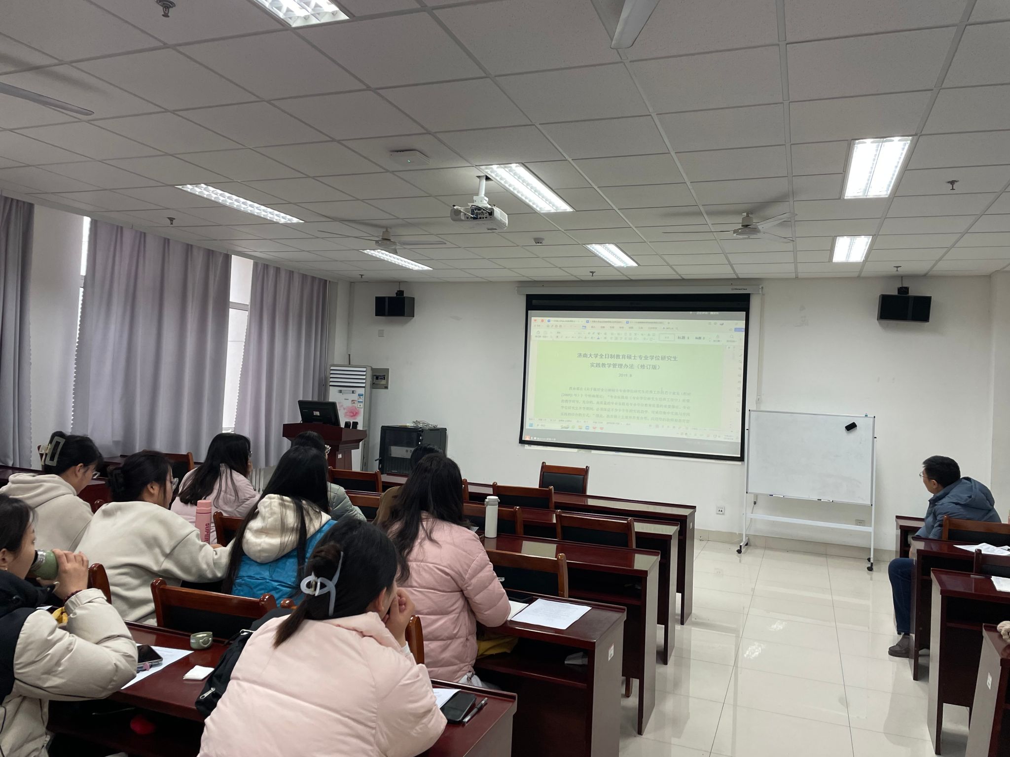 魏淑华主任详细讲解了《济南大学全日制教育硕士专业学位研究生实践教学管理办法》及不同专业领域培养方案对专业实践的不同要求,分别从实习内容、实习时间、实习材料的撰写、实习步骤、教育实习成果展等方面布置了实习任务。她要求所有实习研究生必须全程、主动参加所有的教育教学实习活动,学习优秀教师的师德风范和教育教学方法,并严格按照方案要求的实习时间执行实习工作内容,认真完成各项实习任务,做好实习笔记和实习总结。