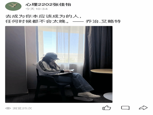 本次读书摄影征集活动通过用镜头记录学生的阅读瞬间的方式开展,学生以此展现了对阅读的热爱与执着。有的照片记录了在宁静的图书馆里,同学们沉浸在书海中的专注神情;有的捕捉了阳光洒在书页上,光影交错的温馨画面。这些照片不仅记录了阅读的瞬间,更传递出阅读带来的内心平静感与满足感。学生通过镜头,分享了他们在阅读过程中的感悟与收获,纷纷表示感受到了阅读的魅力,激发了他们对阅读的兴趣,今后也会让阅读成为一种生活方式,融入到日常中。