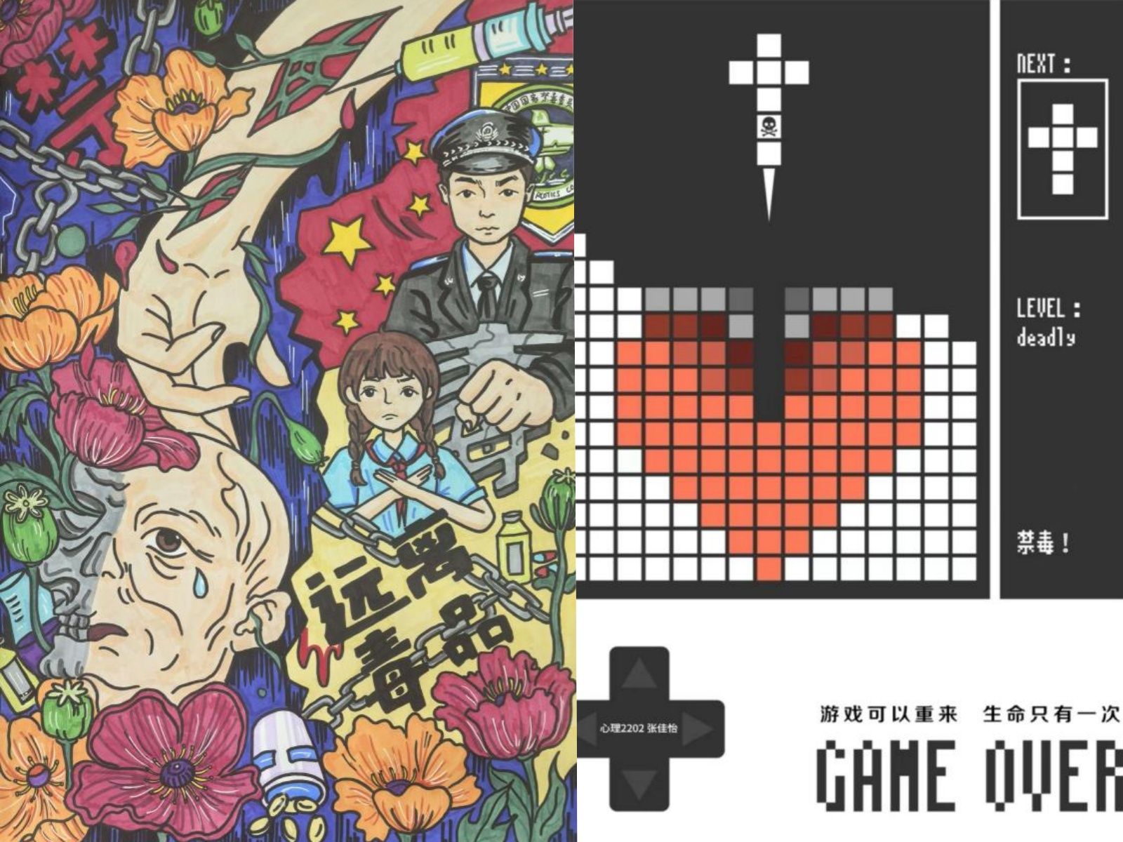 活动分为短视频、公益海报和文创作品三大赛道。参赛学生围绕禁毒主题,以剧情短片、科普动画、平面设计、书法绘画等形式,创作出一批富有创新性和传播力的作品。短视频类作品通过生动的故事和科学的知识普及毒品危害;公益海报以艺术感染力传递拒毒理念;文创作品则以沉浸式体验展现禁毒主题。所有作品突出了科学性、创新性和传播性,并严格遵守原创要求。