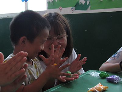 为增强儿童的动手能力,拉近儿童与志愿者的关系,第一趟课志愿者特地选择了互动能力强的太空泥课程。课程伊始,志愿者向每一位小朋友询问了他们喜欢的颜色并分发太空泥;随后采取一人主讲,多人助力的授课模式,确保每一位小朋友都跟上授课进度。在授课途中,志愿者们采取寓教于乐的方式,与孩子们迅速打成一片。当授课结束后,每一位小朋友桌前都“展览”着自己塑造的三两成就。志愿者们更是借助这节课,在课余时间熟悉着小朋友们的生理心理状态,为之后的支教活动打下坚实的基础。
